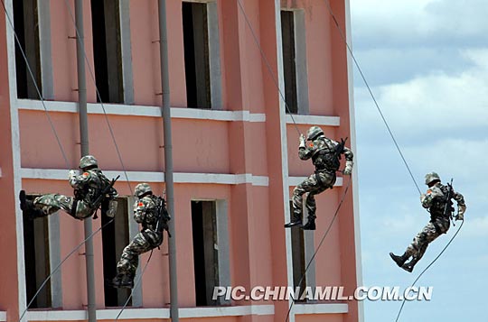 中方特种兵楼顶索降解救人质。张雷 摄