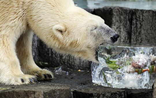 7月26日,日本东京一家动物园内,两只可爱的北极熊正在啃着冷冻着蔬菜的冰块解暑。当日,东京的气温超过30度。