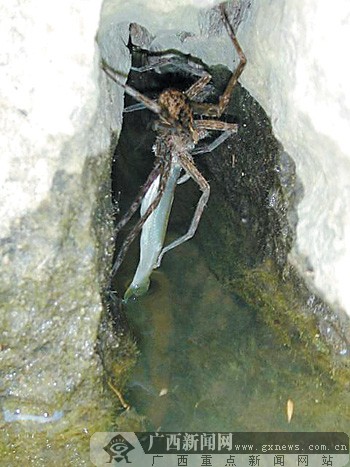 2004年7月,广西一家媒体刊载了一则短新闻——《奇闻!蜘蛛老鼠也捕鱼》。当时,文章作者幸运地在平乐秀溪目睹了蜘蛛快速捕杀小鱼的情景——一只体形较大的蜘蛛,突然从石壁上快速冲向水面,将前足伸进水里,迅速扼住一只游经水面的小鱼,然后拖着小鱼干净利索地爬上石壁。小鱼两腮一张一合,拼命甩尾试图挣脱,无奈却难以如愿。由于蜘蛛已将毒液注入小鱼体内,因此,小鱼只挣扎了一会儿便一命呜呼了。该过程也被作者用相机忠实记录了下来。