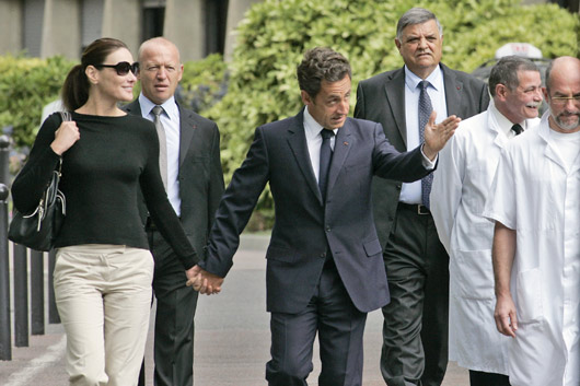 2009年7月27日,26日在慢跑时出现不适后被紧急送院的法国总统萨科齐当日上午在妻子布吕尼的陪同下出院。萨科齐同身着白大褂的医务人员微笑着握了手,但是拒绝发表任何评论。