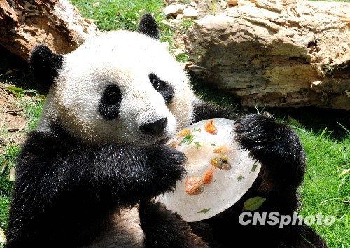 福州连日高温,酷热难耐,福州熊猫世界的大熊猫在饲养员精心照料下,享受着空调、水果、冰块和泡澡带来的清凉。