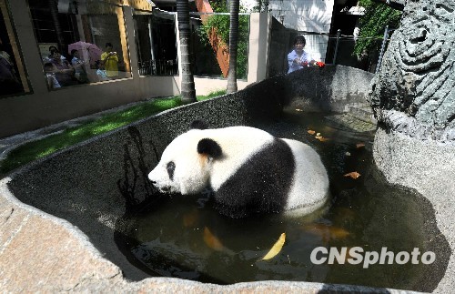 图为7月28日,明星大熊猫“巴斯”在巨石浴缸里享受清凉。中新社发 杨婀娜 摄