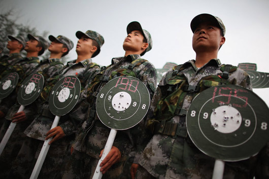 图为官兵在向中外记者展示击中目标的环数。Feng Li/CFP