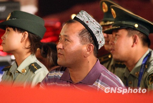 图为在哈密瓜节开幕晚会上聚精会神观看节目的警察与观众。中新社发 钱兴强 摄