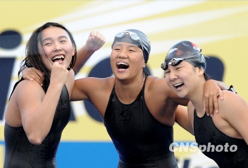 罗马时间7月30日晚上,罗马世锦赛4×200自由泳中中国选手庞佳颖即将抵达终点,一起参加该项目决赛的杨雨、朱倩蔚、刘京在一侧欢庆胜利。当日,4×200自由泳决赛中中国女将力压群芳,打破世界纪录并夺取冠军。这也是中国泳将在本届比赛中的第三枚游泳金牌。 中新社发 廖攀 摄