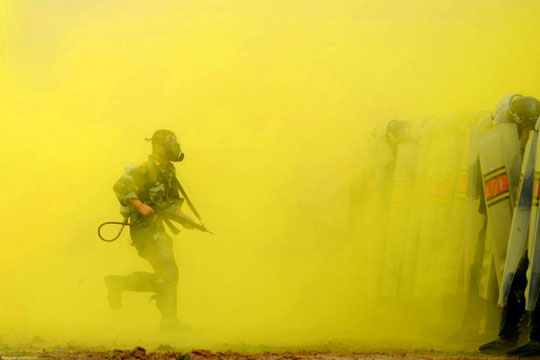 2009年7月31日,武警正在进行反恐大演练。当日,武警江西总队2300名官兵在南昌市隆重举行“迎国庆、庆八一、展警威、保稳定”军事训练成果汇报表演。现场举行了徒步方队、反袭击、反爆炸、反劫持等课目的反恐大演练,以检验和提高武警官兵的反恐作战能力。袁征/CFP