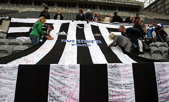 8月1日,英格兰球迷在位于英格兰东北部纽卡斯尔联队主场的圣詹姆斯公园球场展开了一件超大的英格兰队服。球迷们纷纷在上面签名用以纪念7月31日因癌症逝世的前英格兰队主教练罗布森。