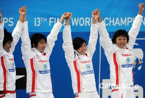 罗马时间8月1日晚,罗马游泳世锦赛女子4X100米混合泳接力颁奖仪式上,金牌得主赵菁、陈慧佳、焦刘洋和李哲思四位中国女登上领奖台。她们在女子4X100米混合泳接力比赛中夺得冠军并打破世界纪录。