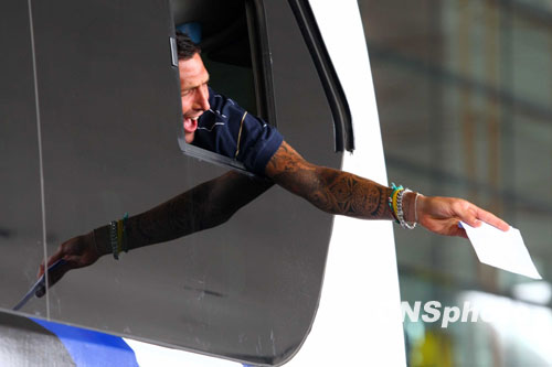 图为马特拉齐在大巴车上给球迷签名。中新社发 富田 摄