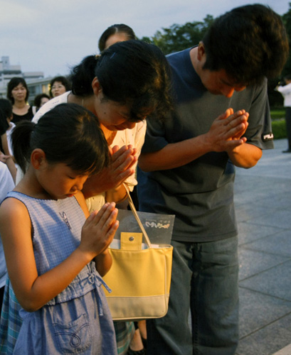 图为一个日本家庭在日本广岛和平纪念公园祈祷。