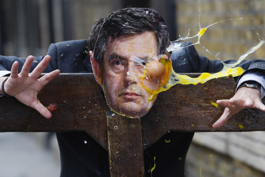 8月6日,英国伦敦,英国首相布朗的头像被安放在街头的一处“断头台”上,被过往的行人用鸡蛋砸。2008年以来,英国陷入经济危机泥潭,加上近来国会开支丑闻曝光,布朗遭到在野党的批评。