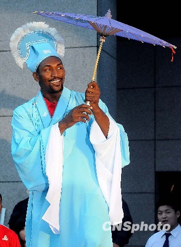 8月6日,NBA大牌球星阿泰斯特造访杭州与杭州球迷见面,并大秀阿泰斯特版《白蛇传》。中新社发 引炜 摄