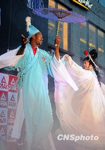 图为NBA大牌球星阿泰斯特造访杭州大秀阿泰斯特版《白蛇传》。