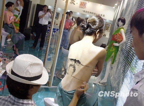 8月7日,北京性用品展上正在被彩绘的人体模特。当日第五届中国计划生育生殖健康新技术新产品博览会在北京开幕。中新社发 郑雄增 摄