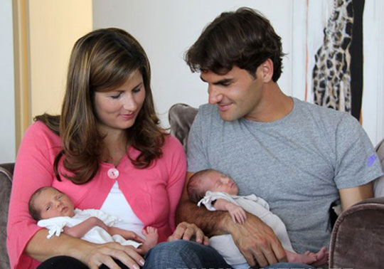 8月7日,费德勒(右)和妻子米尔卡在位于瑞士苏黎世附近的家中抱着他们的双胞胎女儿的照片公布。7月24日,米尔卡生下了这对名为米拉罗斯和查伦莉娃的双胞胎。