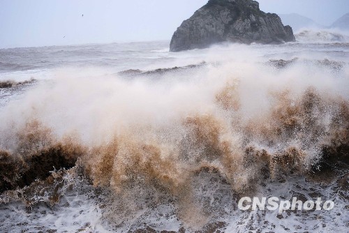 8月8日10时,受台风“莫拉克”影响,温州洞头海面巨浪滔天。图为巨浪淹没岸边礁石。中新社发 叶海峰 摄