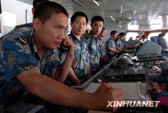 当地时间8月6日15时(北京时间20时)许,中国海军第三批护航编队成功驱离多艘疑似海盗船只,使中国商船“振华25号”转危为安。图为“舟山”号导弹护卫舰官兵正在记录接报信息。 郭刚 摄