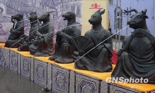 八月九日上午,由江苏农民企业家冷贝生先生精仿的圆明园十二生肖兽首人身复原像首次正式向世人亮相。据了解,此次圆明园十二生肖兽首人身复原工程是由冷贝生的公司在北京圆明园管理处的指导下,采取了同比例、同材质的复原制作方式,并且攻克了一百五十年前十二生肖的喷水报时功能这一难关,展现在人们面前的十二生肖兽首人身像与文物大小、材质完全一致。图为圆明园十二生肖兽首人身复原像整点同时喷水。中新社发 孙翔鸣 摄