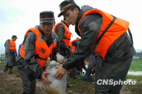 8月9日,福州市马尾区亭江镇长柄村沿江一段江堤塌方告急,危及长柄村路段的104国道、500多亩农田和几十个养殖场。福建省公安边防总队海警一支队二大队闻讯冒雨赶赴险堤,经过三个多小时的奋战,用编织袋装泥筑牢了堤坝。中新社发 张炜 摄