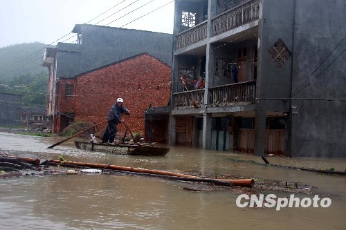8月9日,福鼎南墘村村民在被淹没的村间小道上划水行舟。受台风“莫拉克”强降雨的影响,福建宁德福鼎南墘村大面积受淹,大水同时也将通往该村的道路全部淹没,致使该村犹如“孤岛”。中新社发 王东明 摄