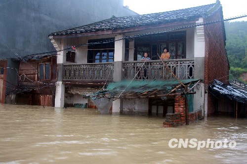 八月九日,受台风“莫拉克”强降雨的影响,福建宁德福鼎南墘村大面积受淹,大水同时也将通往该村的道路全部淹没,致使该村犹如“孤岛”,该村近三百名村民被困。中新社发 彭登笋 摄