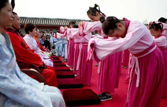 2009年8月9日,参加成童礼仪式的孩子们向家长行礼答谢。当日,河南省永城市芒砀山广场35名8至14岁的儿童身着汉代服饰,按照传统方式参加了成童礼仪式。通过活动让参加礼仪的少年告别童年、感恩立志,知晓父母养育之恩,学会孝敬父母。王文/CFP