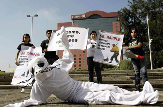 环保人士装扮成海豹的模样抗议捕杀海豹。