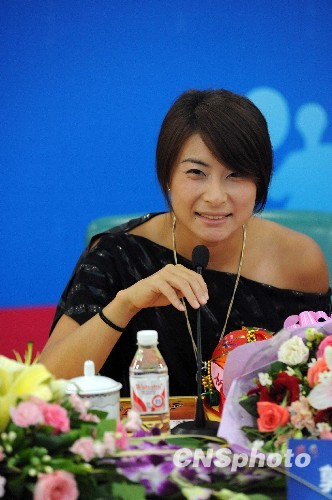 图为郭晶晶穿露肩装出席发布会。中新社发 蒋雪林 摄