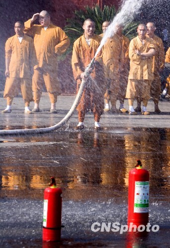 图为白马寺僧人正在消防官兵的指导下进行实战灭火演练。中新社发 张晓理 摄