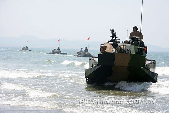 红军水陆两栖坦克向蓝方阵地发起冲击。张军荣 摄