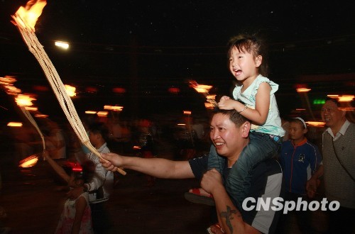 一对父女开心地参加火把狂欢大巡游活动。中新社发 甘娜 摄