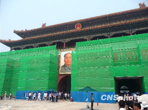 图为北京天安门城楼搭起了绿色围挡。中新社发 玉龙 摄