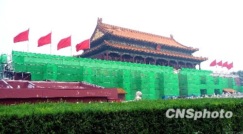 图为北京天安门城楼搭起了绿色围挡。中新社发 玉龙 摄