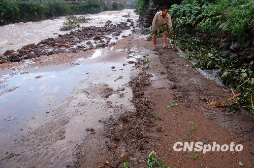农民在被暴雨冲刷过绝收的庄稼田地中。 中新社发 许康平 摄