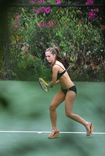 据英国媒体8月16日报道,美国女星珍妮弗洛芙休伊特与男友在夏威夷渡假时,身穿比基尼脚踏高跟鞋一起打网球,而且连破男友2次发球局。