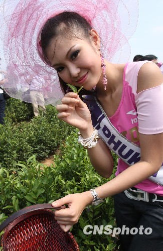 8月17日,来自120个国家的2009国际旅游小姐冠军总决赛佳丽,来到河南信阳进行分赛暨巡游活动,图为各国佳丽在茶山体验采茶乐趣。中新社发 钱兴强 摄