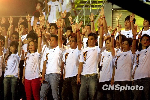 八月十七日晚,香港举办《8·8水灾关爱行动》演唱会,著名演员谭詠鳞、刘德华、张学友正在演唱。中新社发 张勤 摄