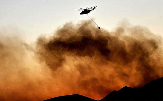 8月17日,在希腊首都雅典以北的希瓦市,一架救援直升机正在扑救山火。希腊中部地区发生的森林山火已经损毁了大片树林和房屋。