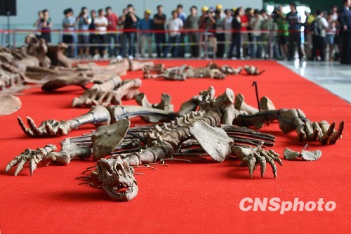 8月18日,为恭贺中国科学技术馆新馆9月16日开馆,及新中国成立60周年,由云南省向中国科技馆捐赠的三具恐龙化石正式揭开红盖头。三具恐龙化石分别是号称中国乃至亚洲最大的恐龙化石,长达27米、高6.5米的阿纳川街龙;中国发掘的最古老恐龙类之一,有“中华第一龙”美誉的许氏禄丰龙;以及将首次在北京亮相的中国双脊龙。三具恐龙化石共有近1000块,其中最长的阿纳川街龙全身骨骼化石就达300多块。中新社发 富田 摄