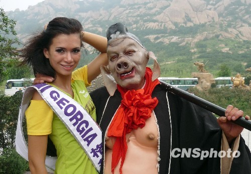8月19日,正在河南参加2009国际旅游小姐冠军总决赛的各国佳丽,来到驻马店著名风景区嵖岈山游览。图为西游文化民俗表演中的猪八戒与游览的国际旅游小姐拍照。中新社发 钱兴强 摄