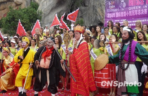图为当地别具特色的西游文化民俗表演唐僧师徒吸引各国佳丽。中新社发 钱兴强 摄