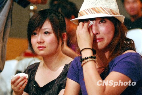 许多选手都拿出自己宝贵的比赛时间,为此次因台风受灾的台湾同胞们现场募捐,令现场台湾选手张美珊(右)和杨小黎(左)感动落泪。中新社发 傅丹丹 摄