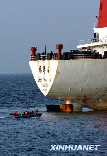 8月20日,中国海军第三批护航编队“舟山”号导弹护卫舰派出的舰载快艇接近“振华14”号商船,准备实施随船护卫。