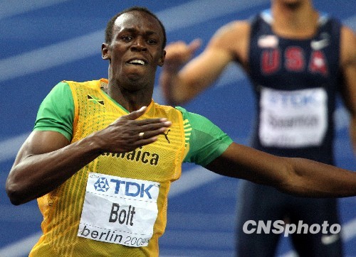 牙买加超级名星博尔特以19.19秒的成绩获得冠军并打破世界纪录。中新社发 任晨鸣 摄