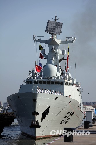 8月21日,中国海军赴亚丁湾、索马里海域执行护航任务的第二批舰艇编队“深圳”号导弹驱逐舰、“黄山”号导弹护卫舰、“微山湖”号综合补给舰及800余护航将士凯旋归来,圆满完成护航任务后顺利返回湛江某军港。图为“黄山”号导弹护卫舰驶抵军港码头。中新社发 孙自法 摄
