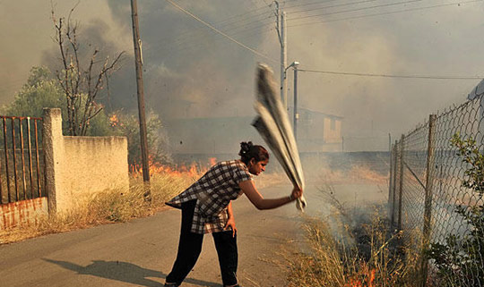 8月20日,希腊首都雅典附近的马古拉村遭到山火袭击,一些建筑被烧毁,人们被迫撤离家园。图为村民正在试图阻止火势蔓延。