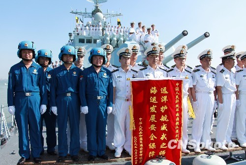 8月21日,中国海军赴亚丁湾、索马里海域执行护航任务的第二批舰艇编队“深圳”号导弹驱逐舰、“黄山”号导弹护卫舰、“微山湖”号综合补给舰及800余护航将士凯旋归来,圆满完成护航任务后顺利返回湛江某军港。图为“深圳”舰护航官兵在舰艏展示交通运输部当天致送的一面锦旗。中新社发 孙自法 摄