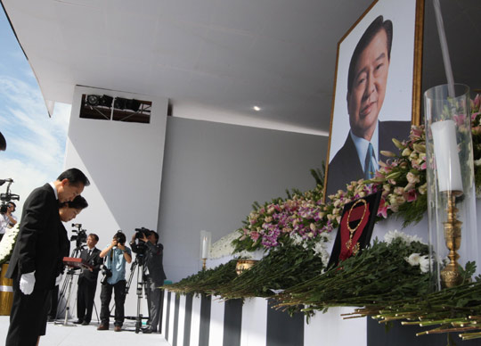 8月21日,韩国首尔,韩国总统李明博来到设在国会的灵堂吊唁前总统金大中。