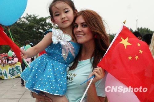 图为新乡幼儿园的小朋友欢迎国际旅游小姐各国佳丽。中新社发 钱兴强 摄