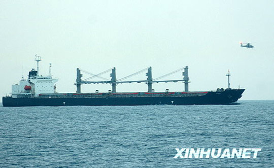 搭载着4名特战队员的“舟山”舰舰载直升机前往“卫远”号商船实施随船护卫。